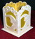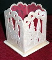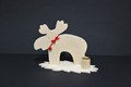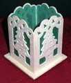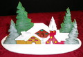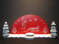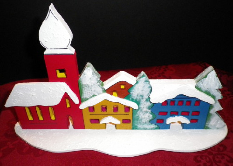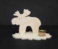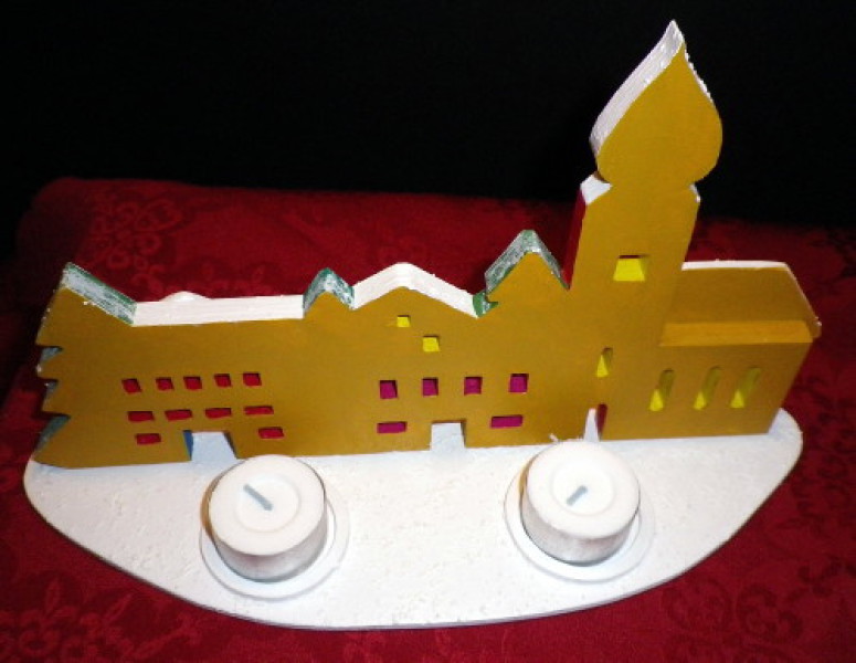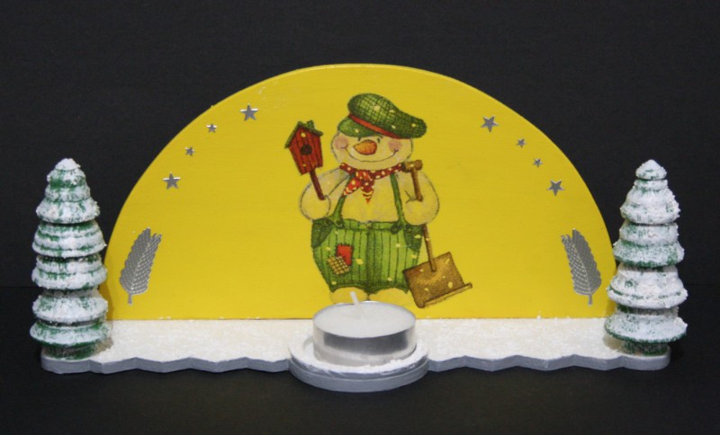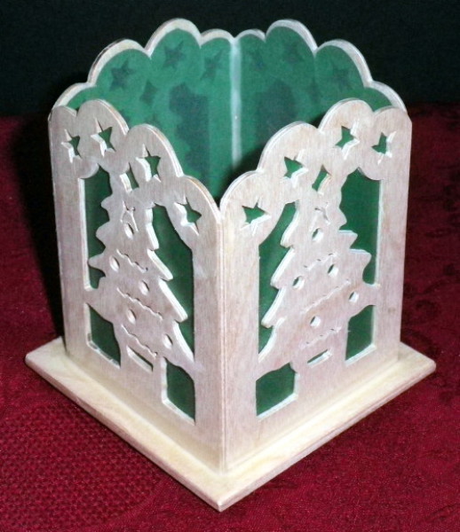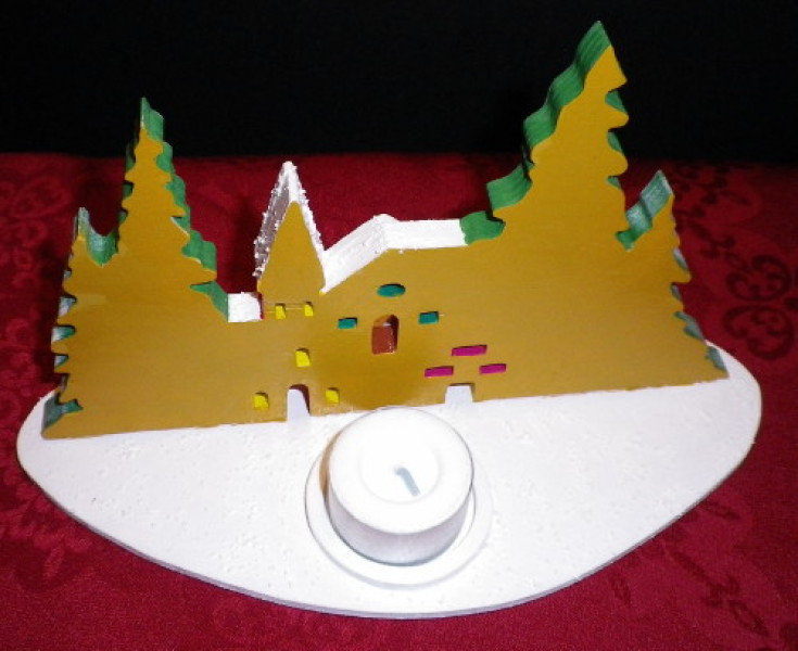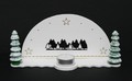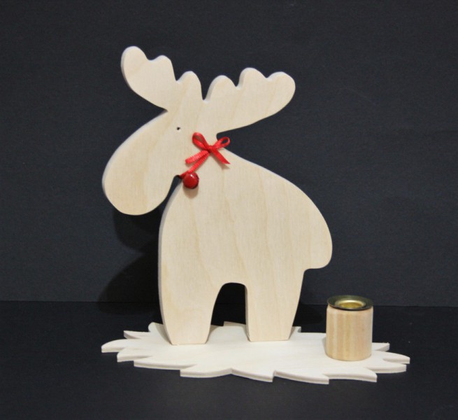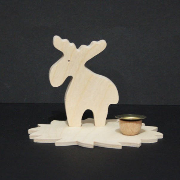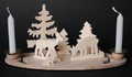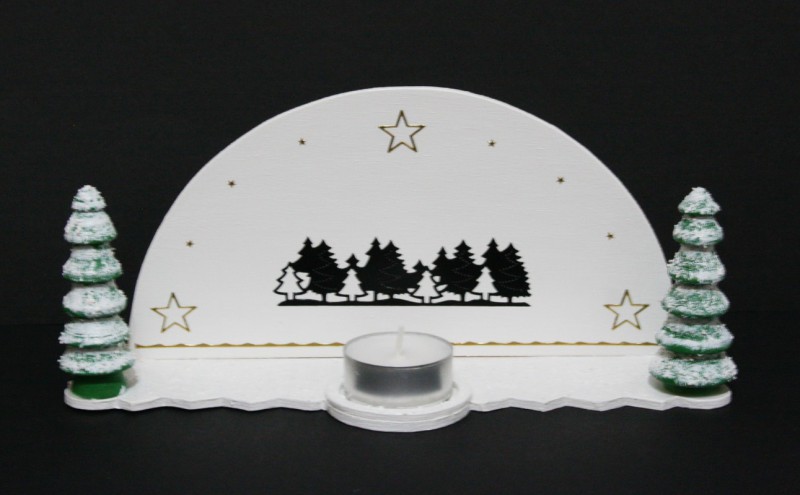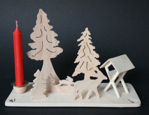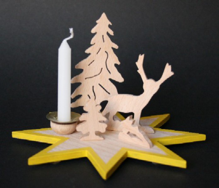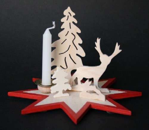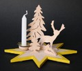 Der Stern ist holzfarben und der Rand mit rot verziert. Auf dem Stern befindet sich ein großer und kleiner Baum, ein Hirsch und ein kleiner Hase sowie 1 Kerzentülle. Die Kerze, wie im Bild